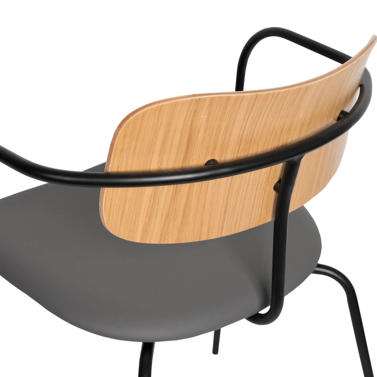 The Academy Arm Chair is an industrial-styled dining chair with a plywood seat and back finished in walnut veneer. The metal legs are finished in matte black. It is a stackable chair and is suitable for both residential and commercial use.