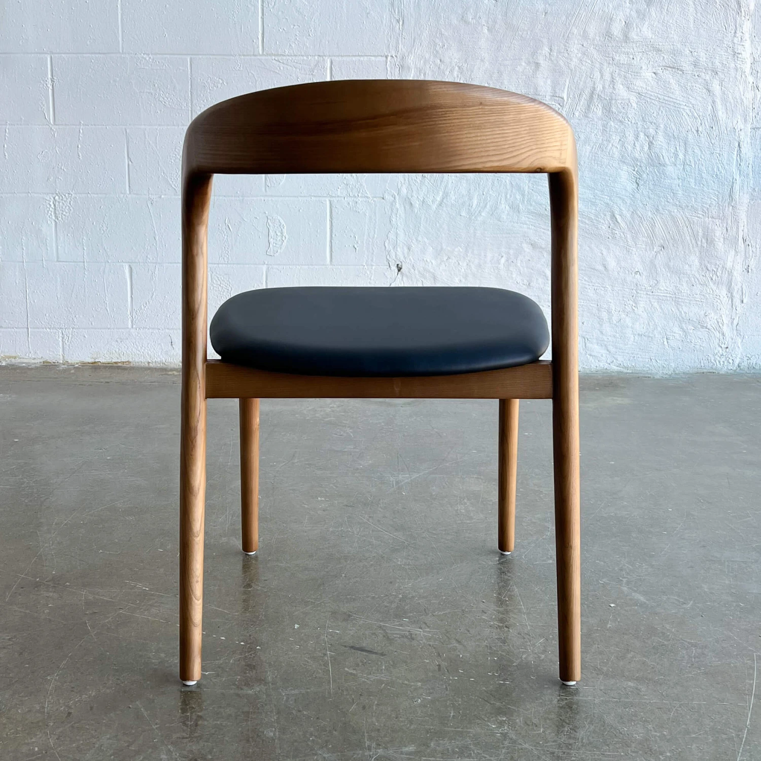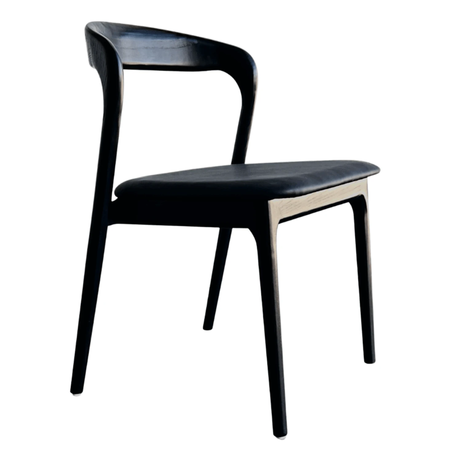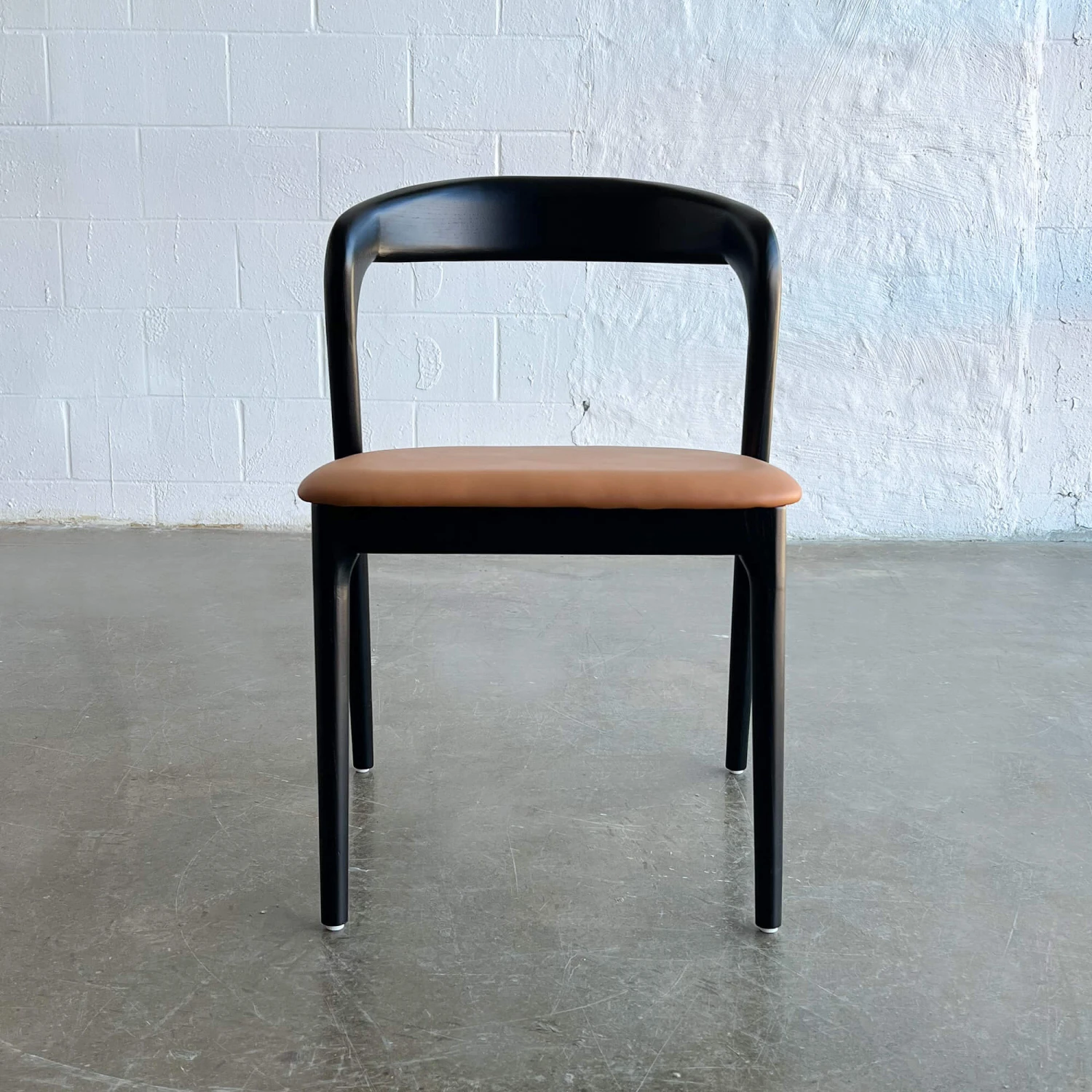 The Amare Dining Chair has an industrial style featuring a black or cognac leatherette upholstered seat. The legs and frame are finished with solid ash finished in black or walnut.