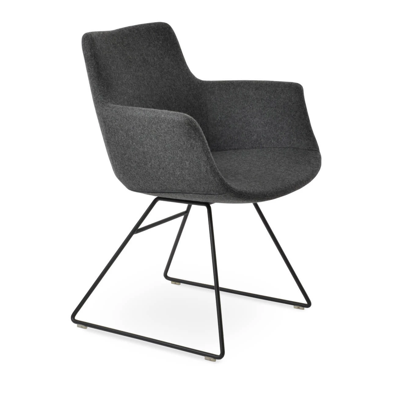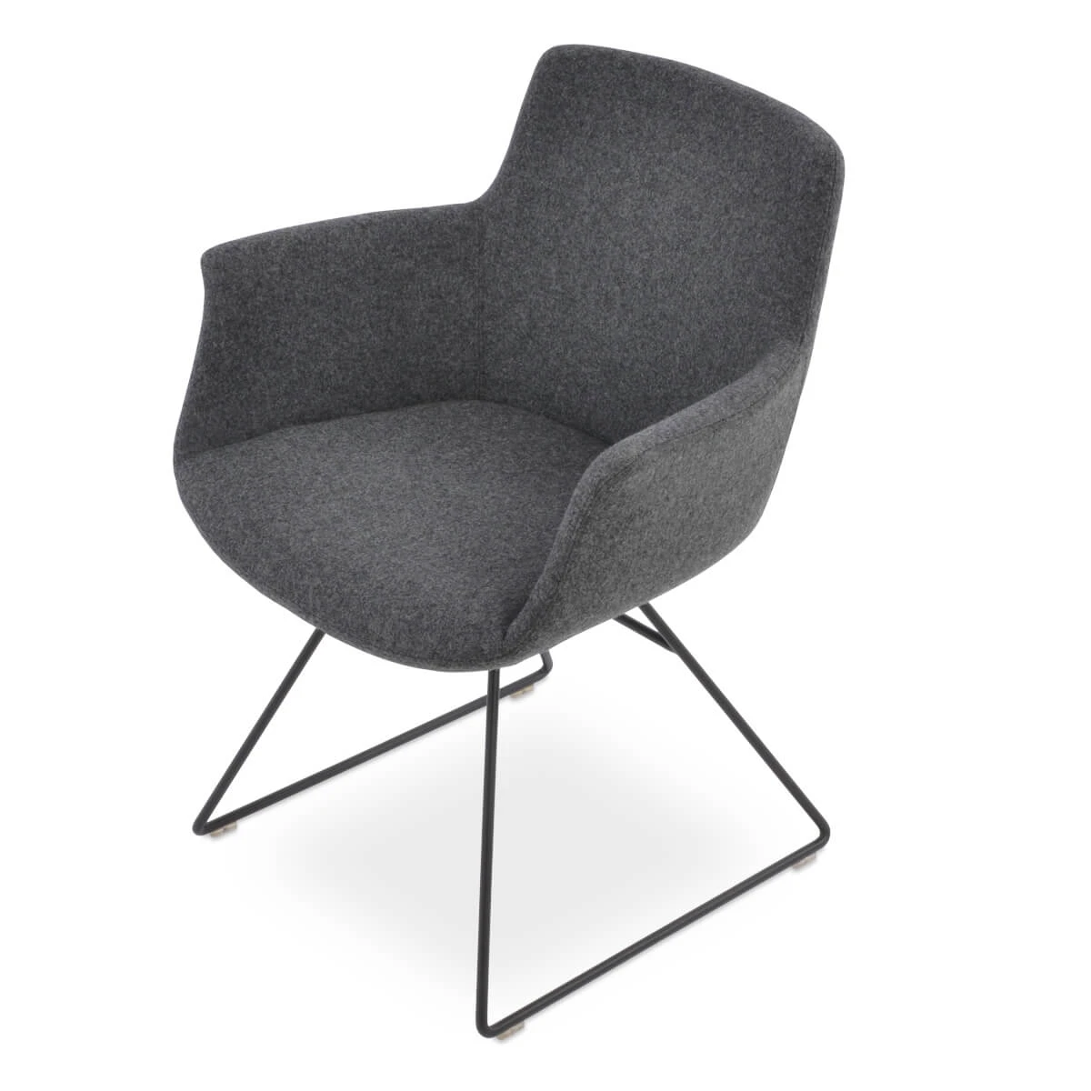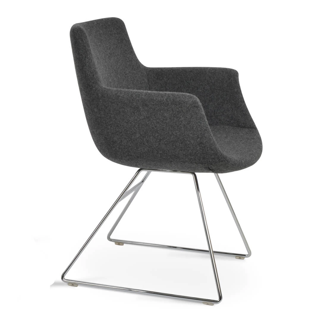 The Bottega Wire Arm Chair is a contemporary dining chair with a comfortable upholstered seat and backrest on a steel sled base. The seat has a steel structure with “S” shape springs for extra flexibility and strength. Bottega seat is upholstered with a removable zipper enclosed leatherette or wool fabric slip cover.