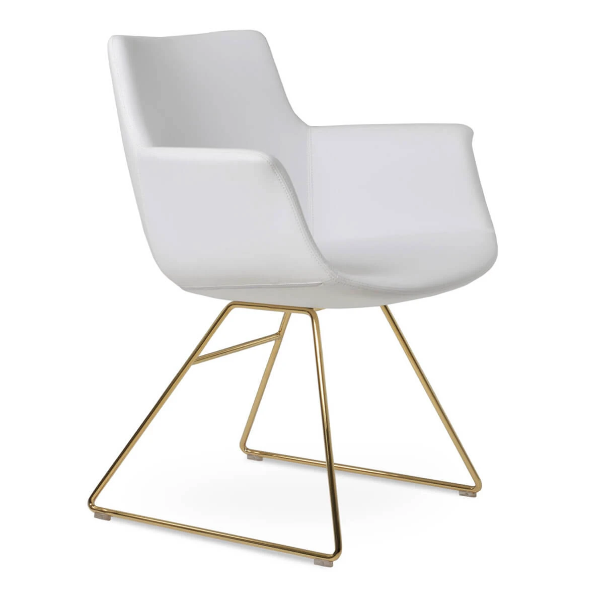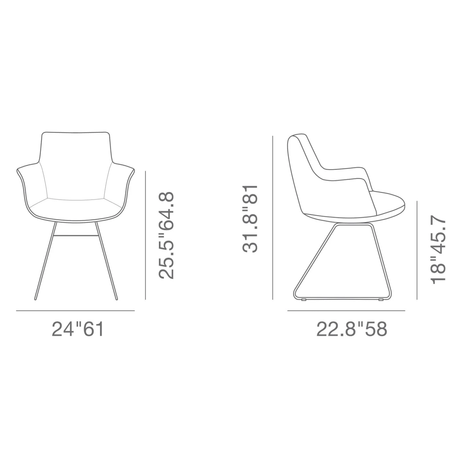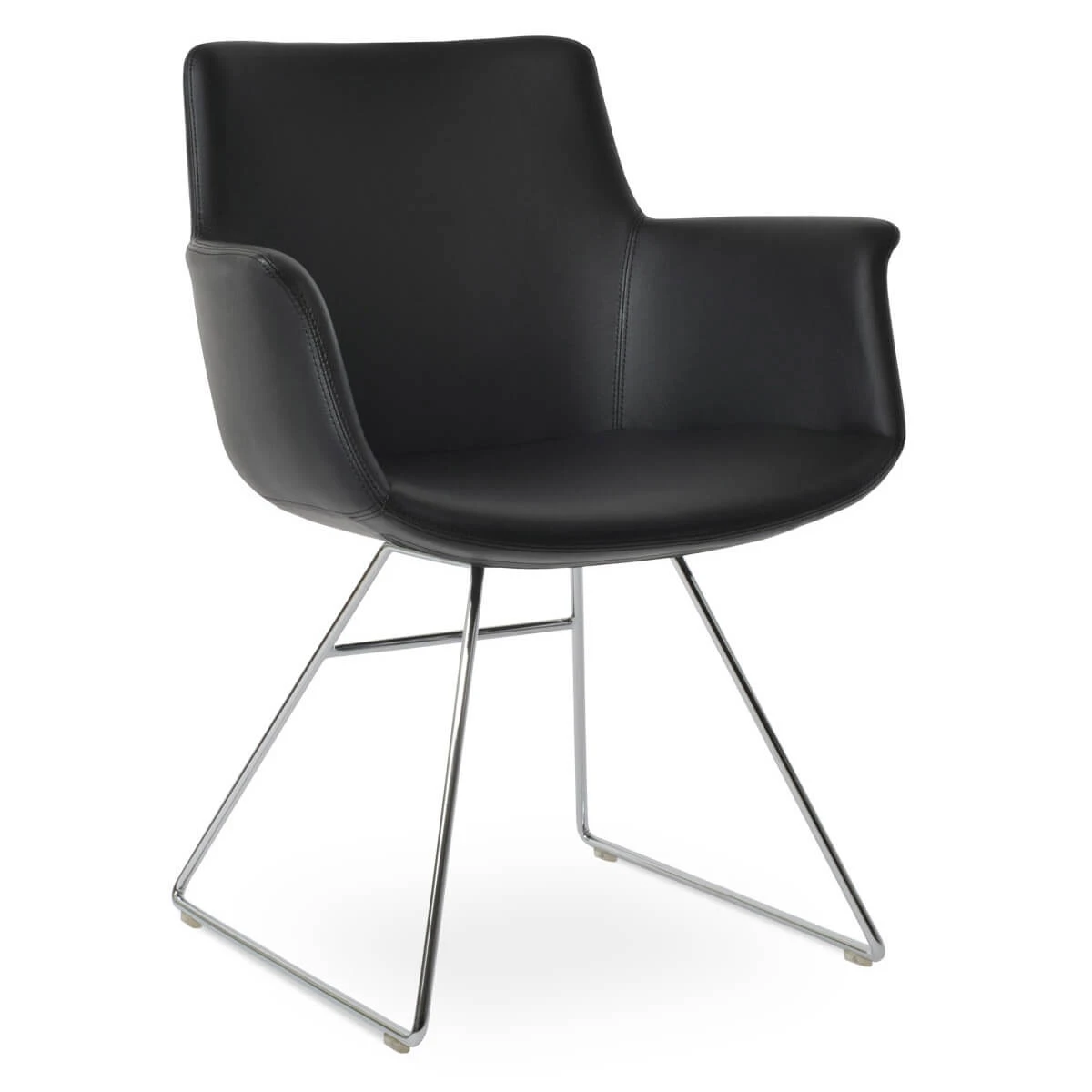 The Bottega Wire Arm Chair is a contemporary dining chair with a comfortable upholstered seat and backrest on a steel sled base. The seat has a steel structure with “S” shape springs for extra flexibility and strength. Bottega seat is upholstered with a removable zipper enclosed leatherette or wool fabric slip cover.
