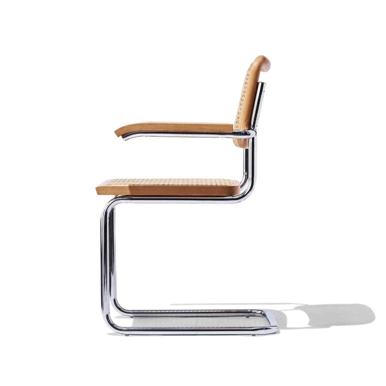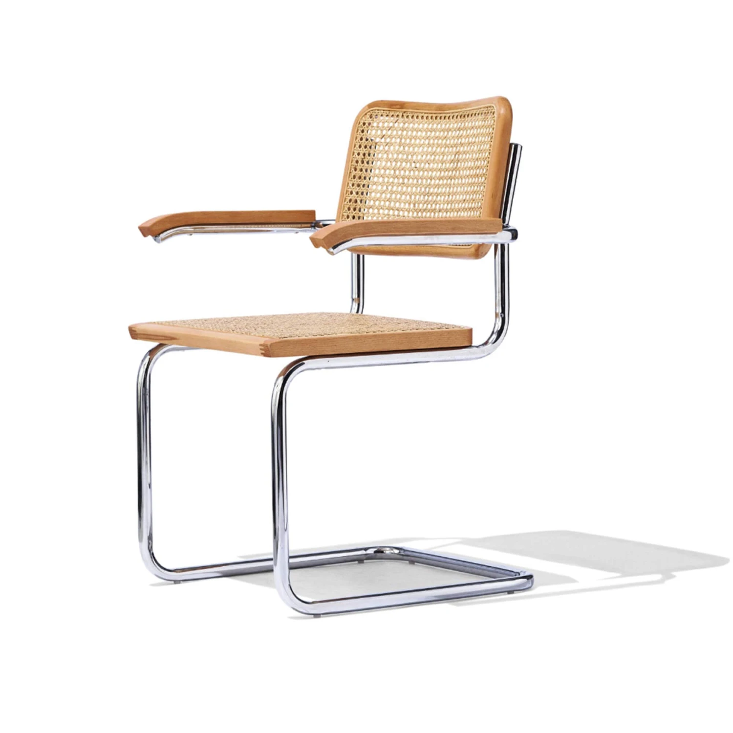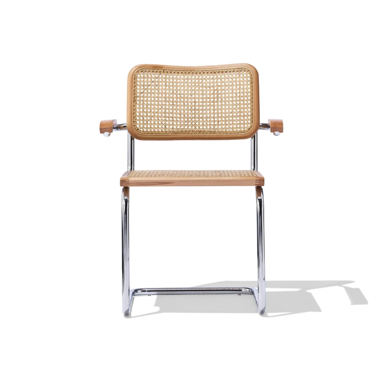 The Cesca Dining Armchair has cantilevered stainless chrome design is perfect for casual dining spaces. The perfectly balanced chrome tube frame provides sturdy support for the woven rattan seat. A durable beech veneered frame surrounds the woven rattan back and seat.