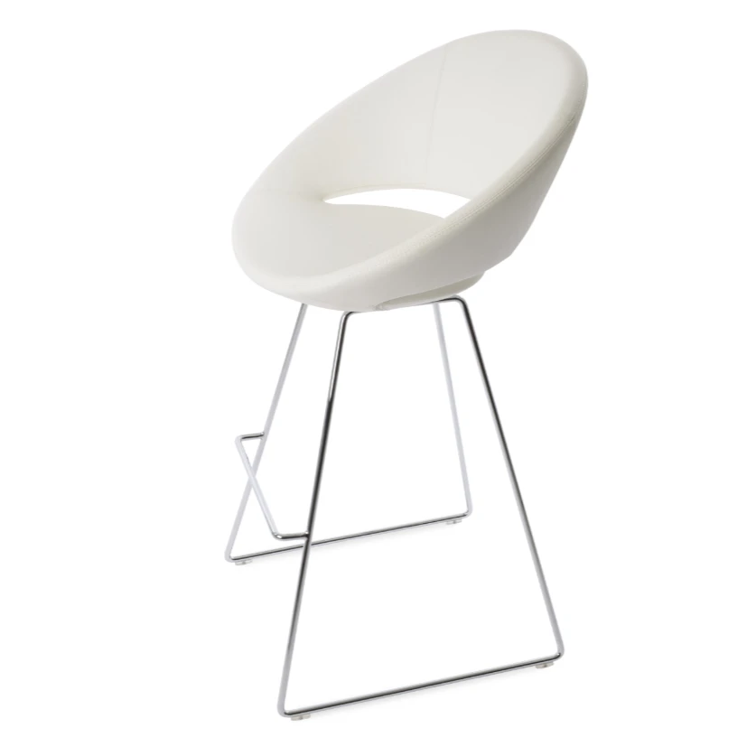 The Crescent Wire Stool is a contemporary counter and bar stool featuring a comfortable upholstered leatherette seat and backrest on a solid chrome steel sled base.