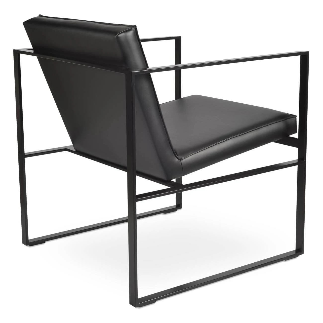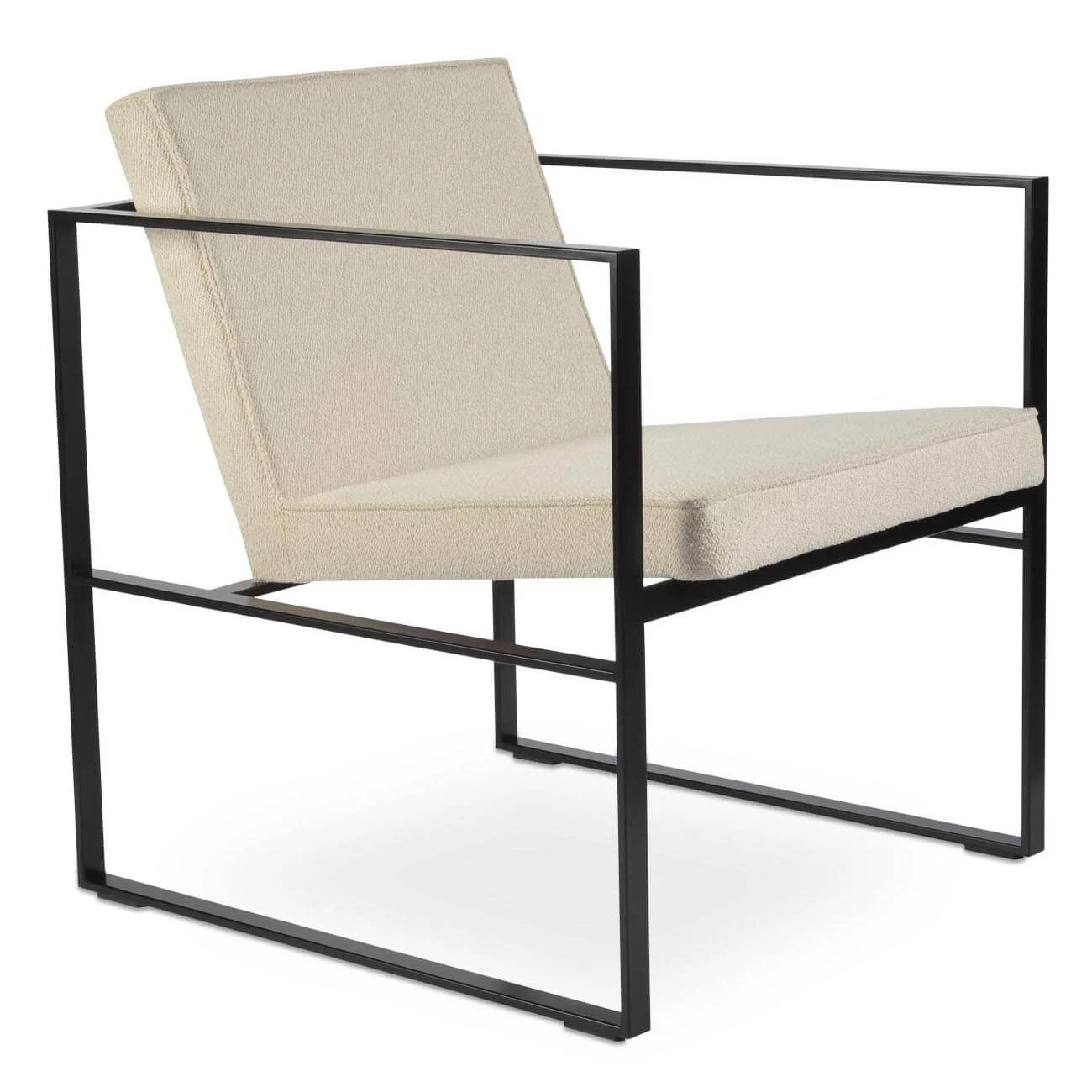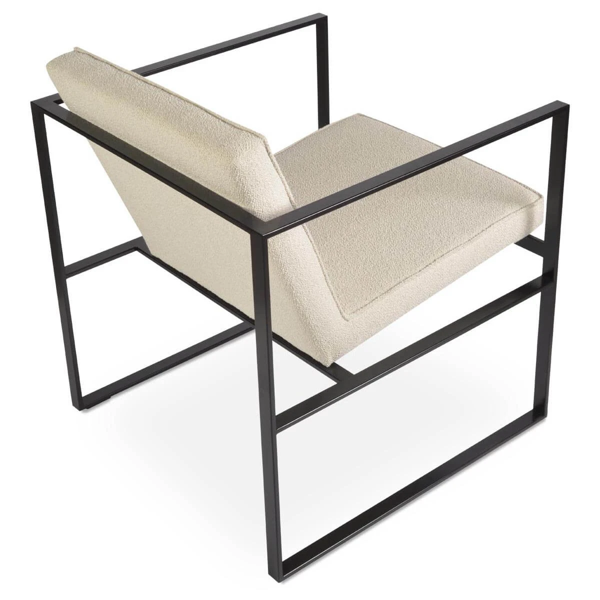 The Cube Metal Lounge Armchair is a contemporary accent armchair with its distinctive solid steel sled base. The solid black steel chair frame structure adds an industrial feel while the padded seat and back cushions add extra comfort. The seat and back cushions are upholstered with leatherette or a boucle fabric. The Cube Metal Lounge is perfect for both home and commercial applications.