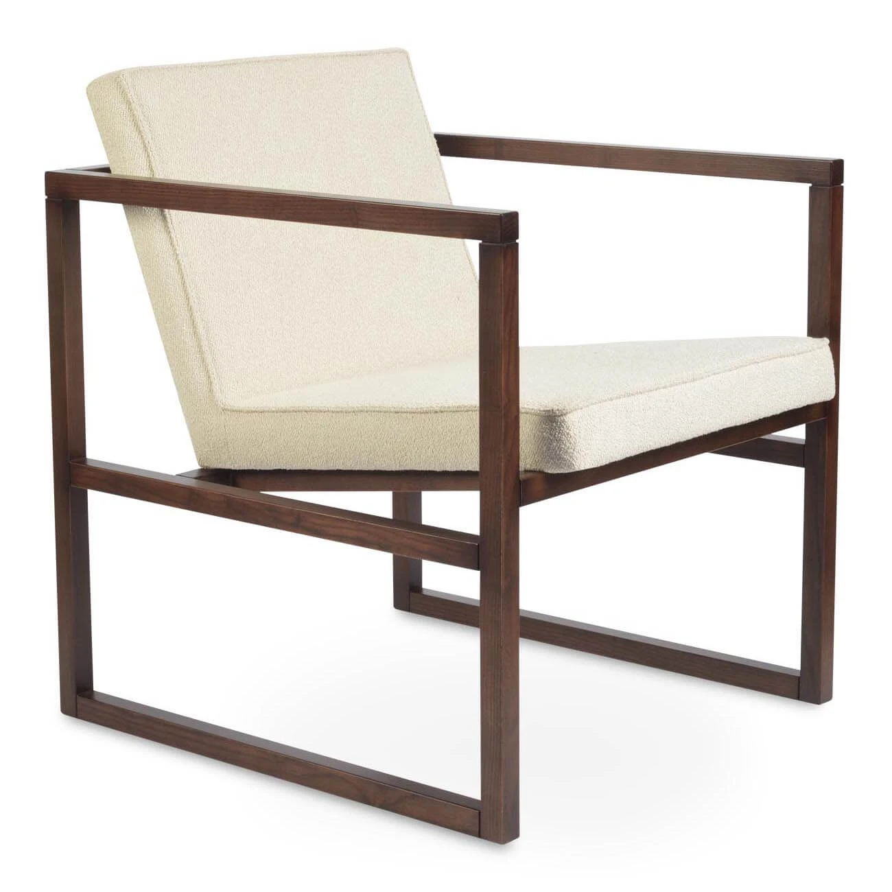 The Cube Wood Lounge Armchair is a contemporary accent chair with a distinctive wood base. The wood frame structure adds an industrial feel while padded seat and back cushions add extra comfort to the chair. The seat and back cushions are upholstered with an off-white or grey fabric. The Cube Wood Lounge is perfect for both home and commercial applications.