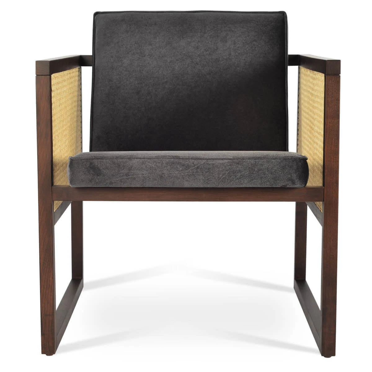The Cube Wood Wicker Lounge Armchair is a contemporary accent chair with its distinctive wood base and wicker sides. The wood frame structure adds an industrial feel while padded seat and back cushions add extra comfort to the chair. The seat and back cushions are upholstered with black velvet fabric. Cube Wood Wicker Lounge is perfect for both home and commercial applications.