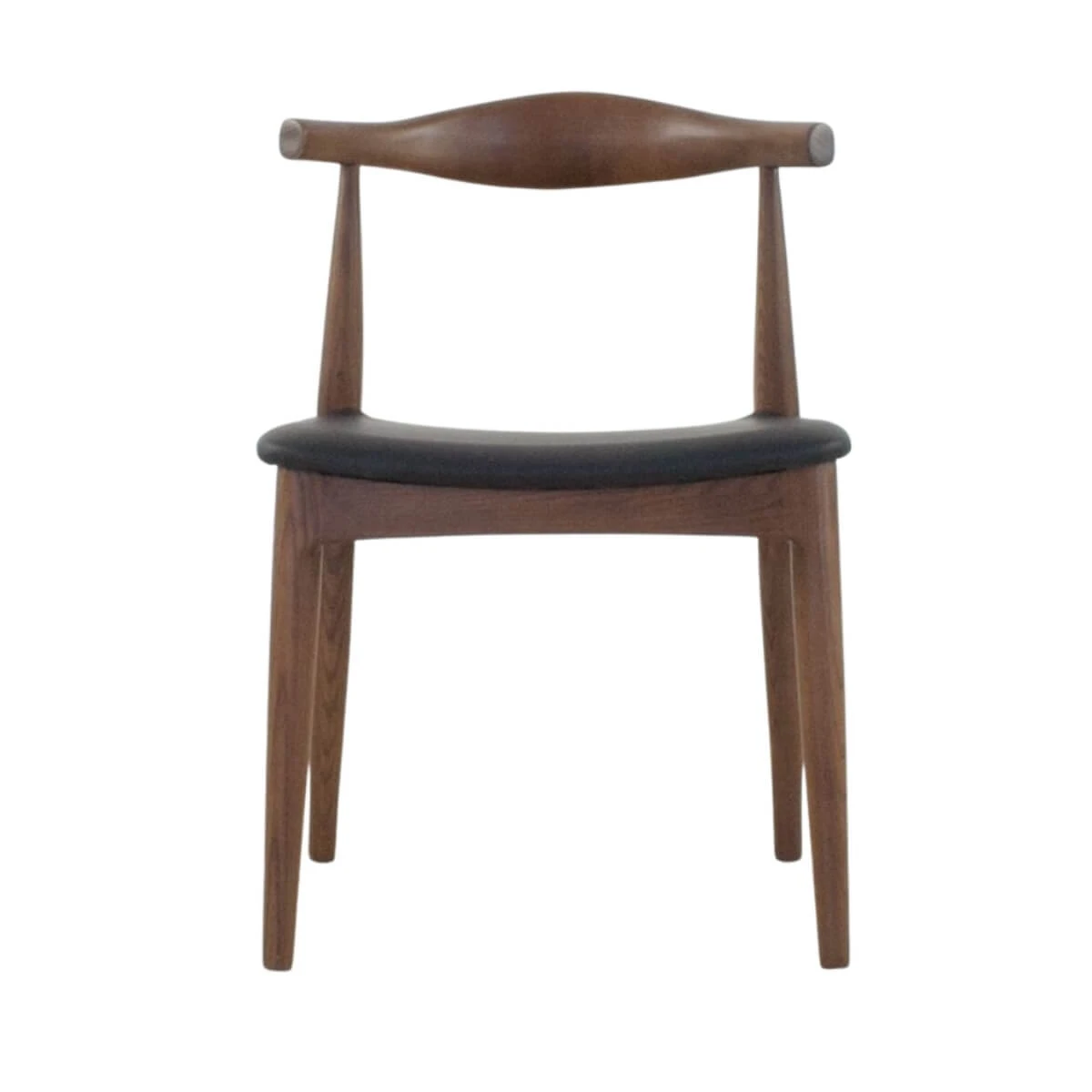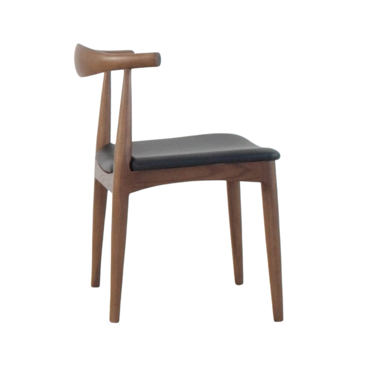 The Elbow Side Chair is a classic chair made of solid ash stained in a dark brown walnut finish with a black leatherette upholstered seat. The Elbow chair is perfect for home and commercial settings.