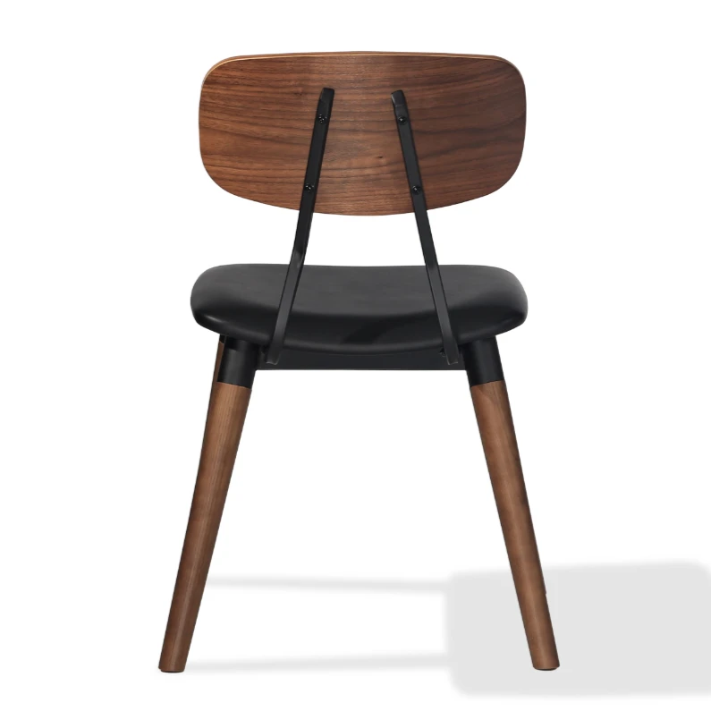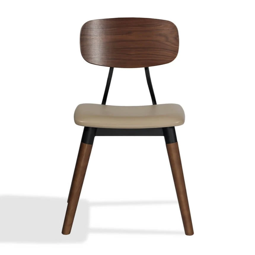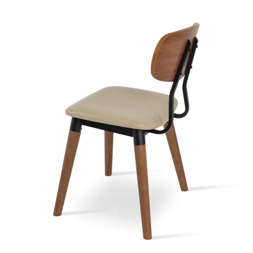 The Esedra Upholstered Seat Dining Chair is a contemporary chair featuring an upholstered seat available in black or wheat leatherette. The frame is a beautiful walnut veneer. The Esedra dining chair is suitable for residential and commercial use.