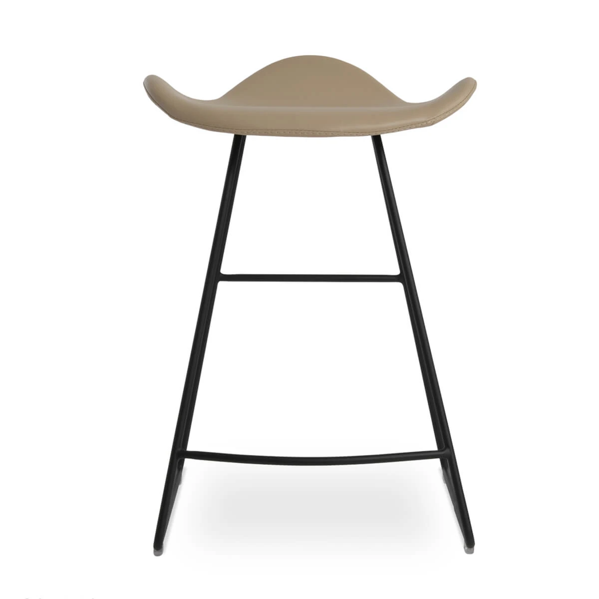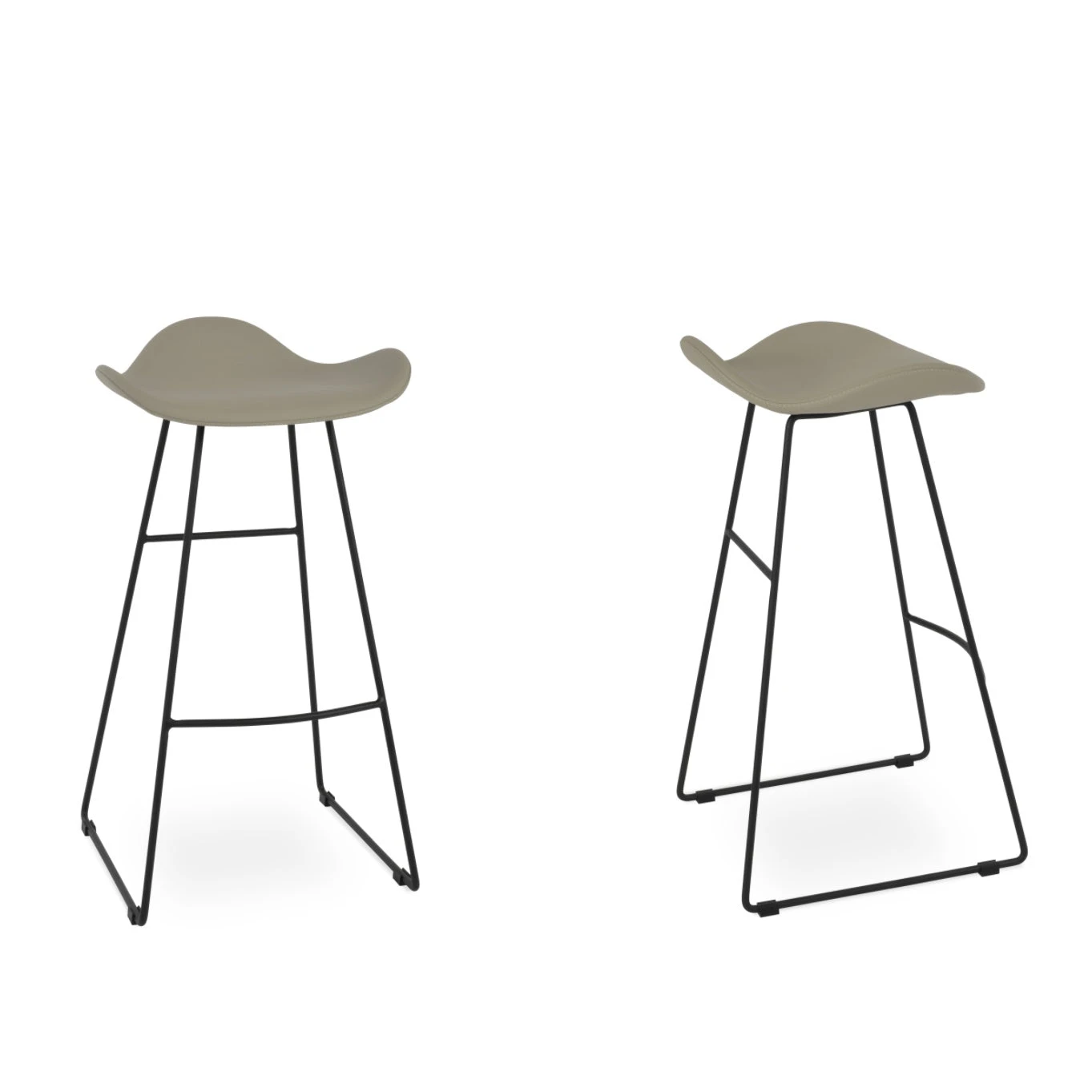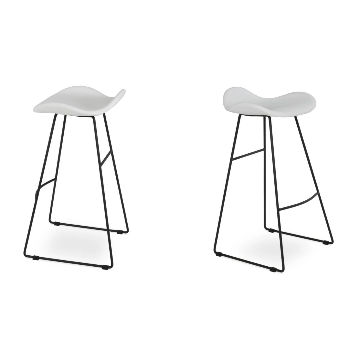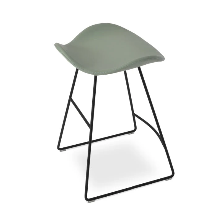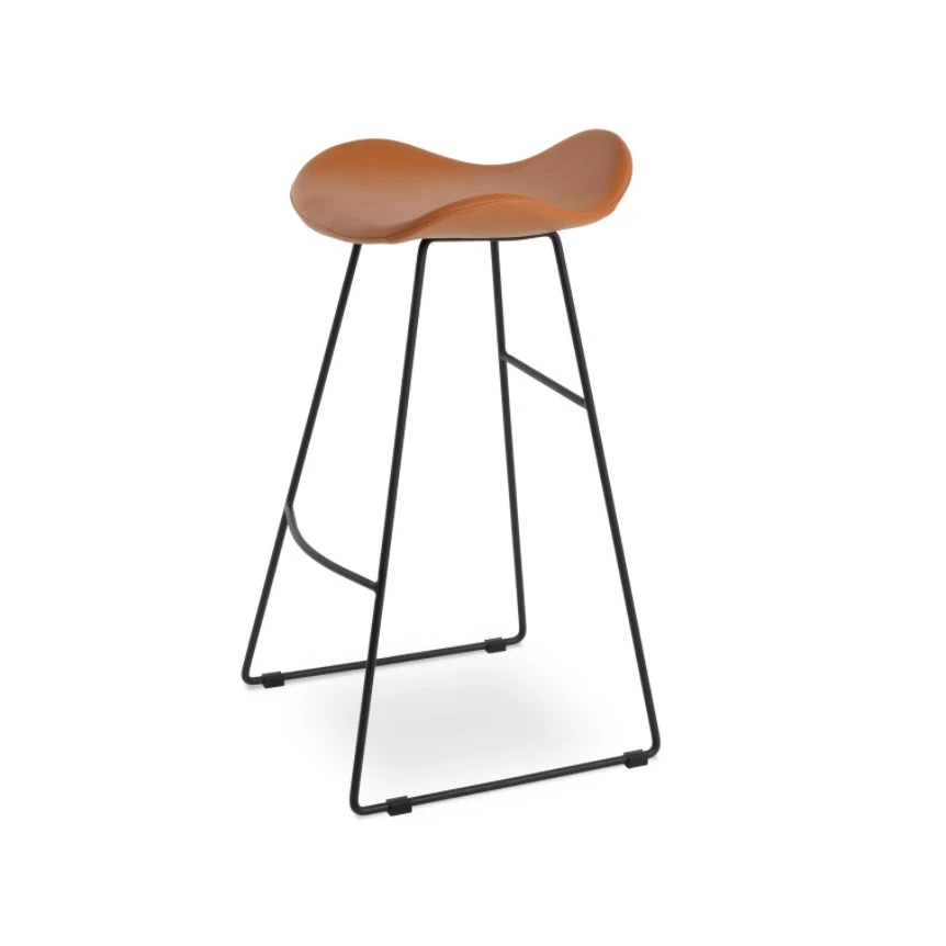 The Falcon Stool is a unique counter and bar stool with a comfortable plywood upholstered seat and backrest on a solid black steel wire base. Each leg is tipped with a plastic glide embedded into the metal wire. The Falcon is great for home and commercial use.