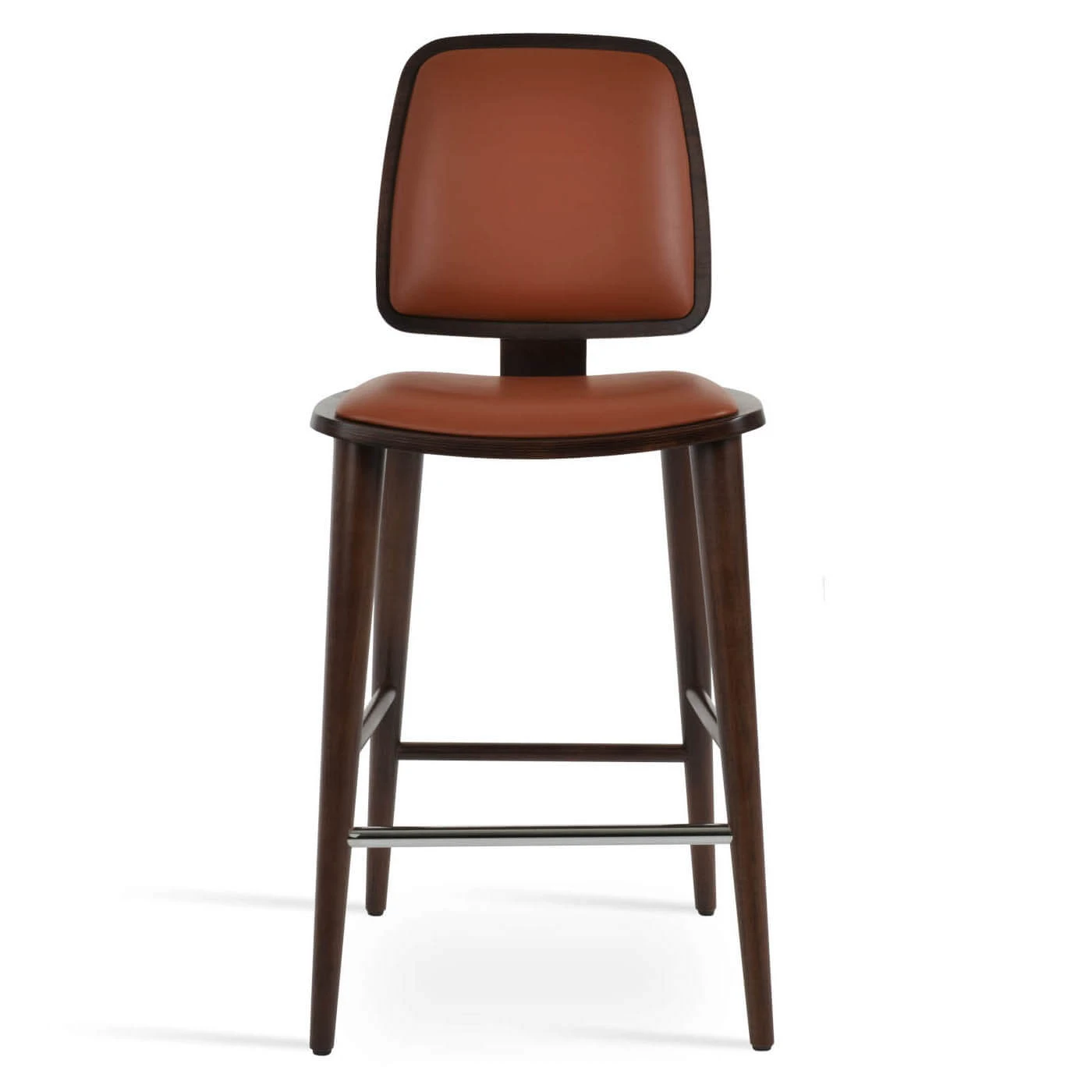 The Ginza Stool features a contemporary design with an upholstered leatherette seat pad. The legs are solid beech with a walnut finish. The Ginza Stool comes in counter stool and bar stool heights and is suitable for both residential and commercial use.