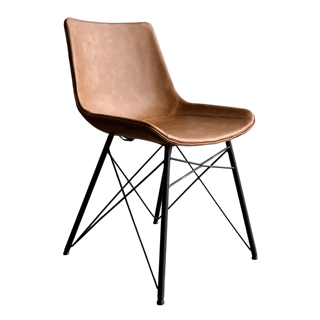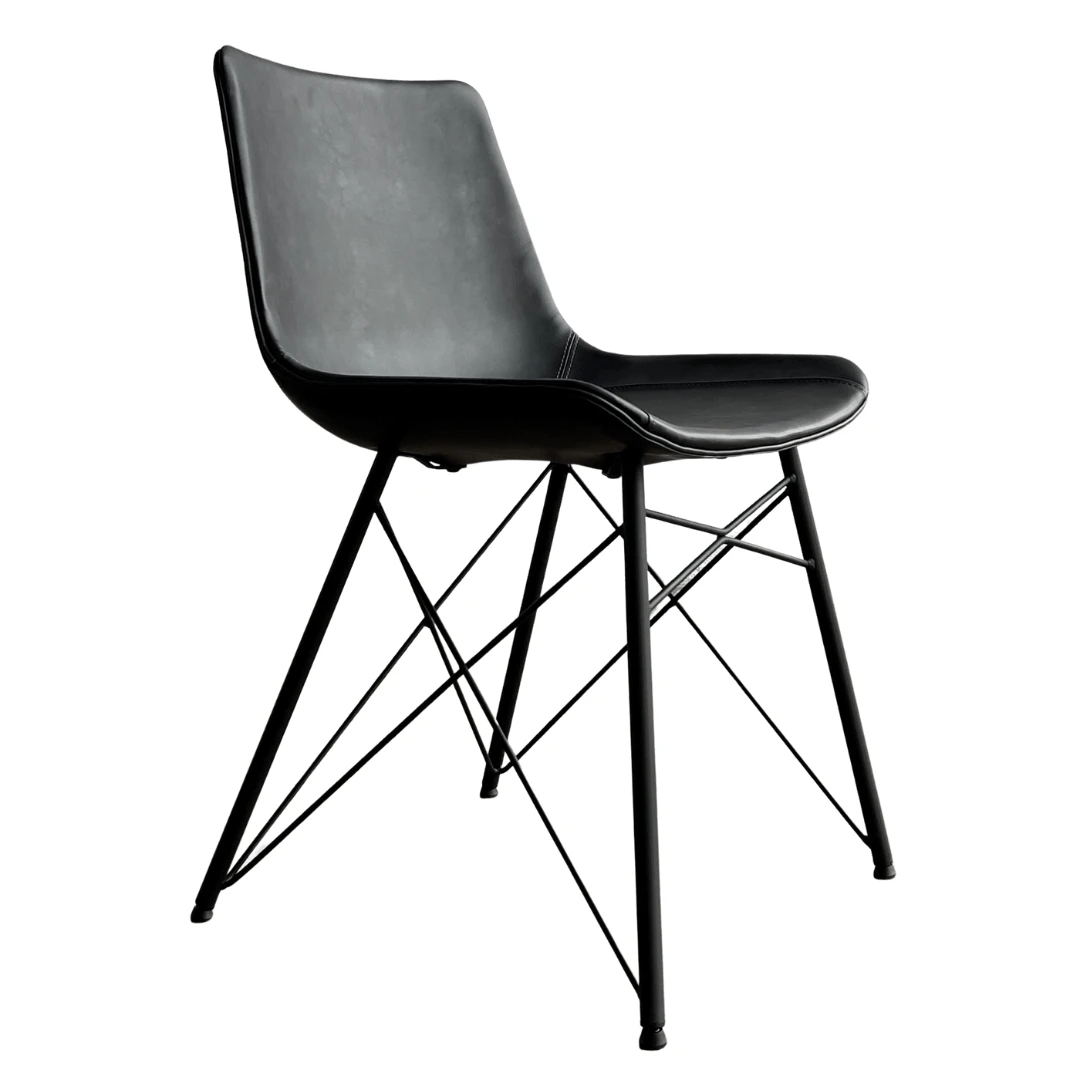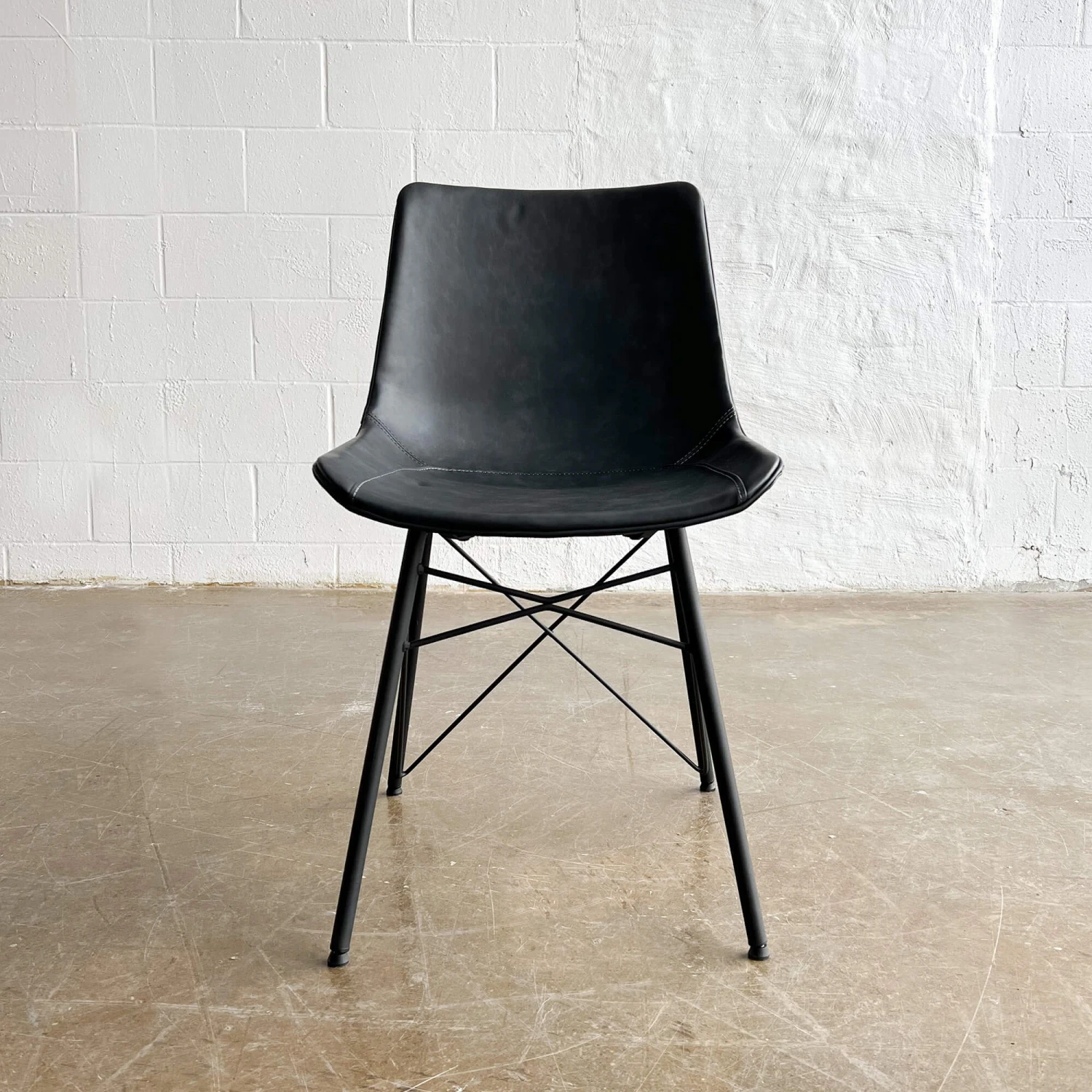 The Gwen Dining Chair is a modern chair that features a foam seat with leatherette or fabric upholstery and a black powder-coated base.
