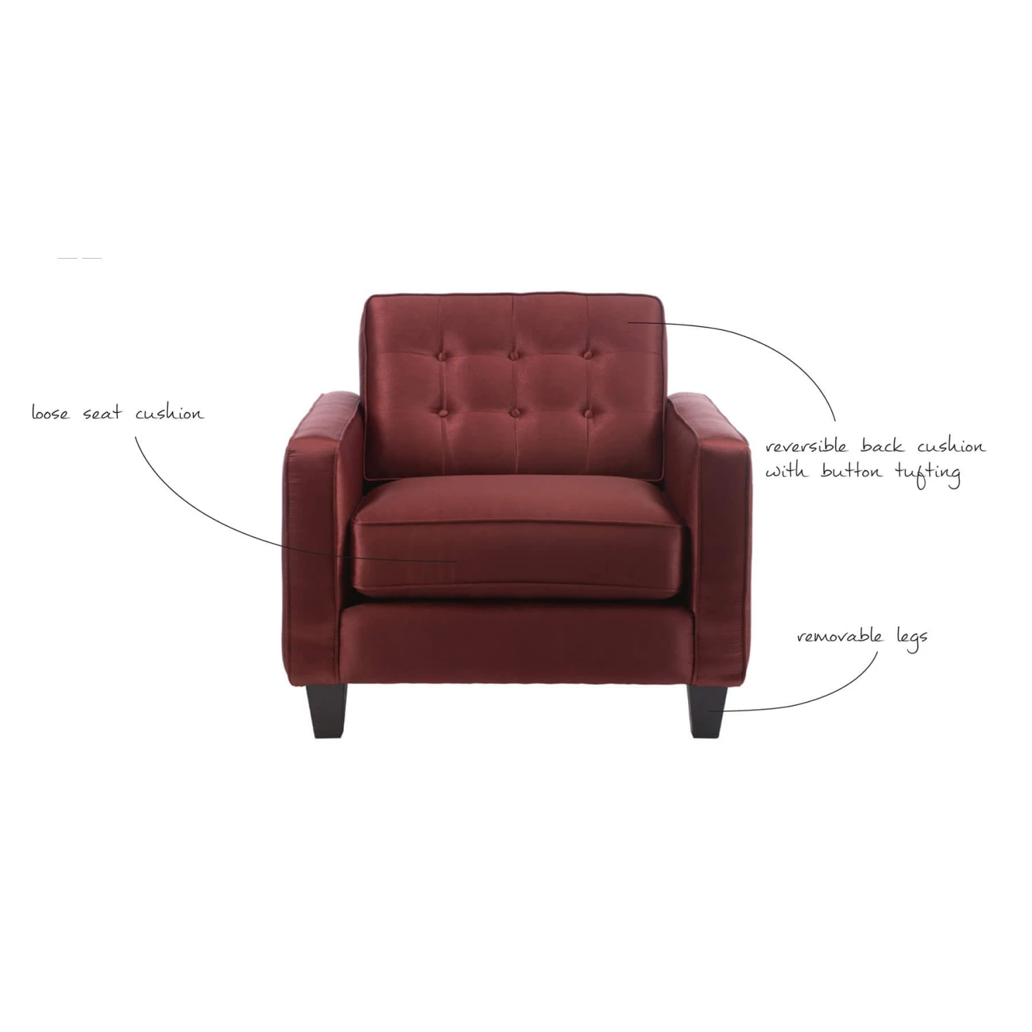 The Jonas Occasional Chair features glamorous button tufting on reversible back cushions. The Jonas has loose seat cushions allowing you to flip them. The solid wood legs are removable which may help with moving it through doorways.