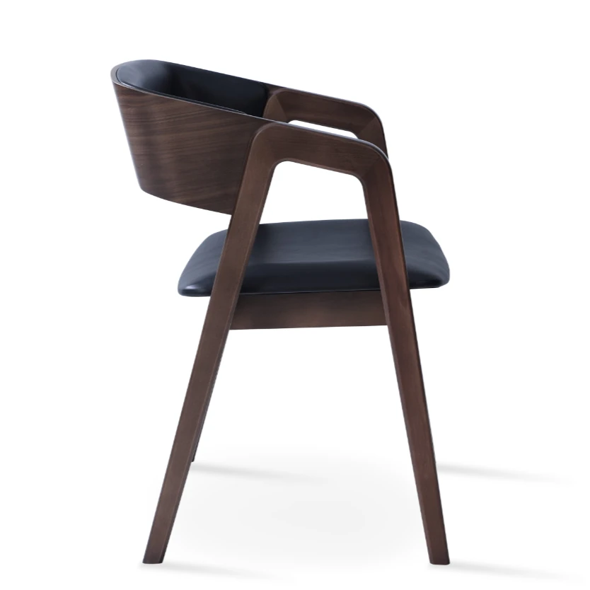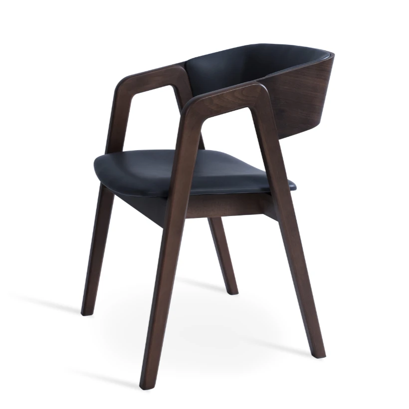 The Myndos Dining Chair is a contemporary armchair with an upholstered seat with wood back support. The Myndos features a solid beech wood frame finished in either a walnut finish with a black PPM upholstery or a wenge finish with a cinnamon PPM upholstery. It’s suitable for both residential and commercial use.