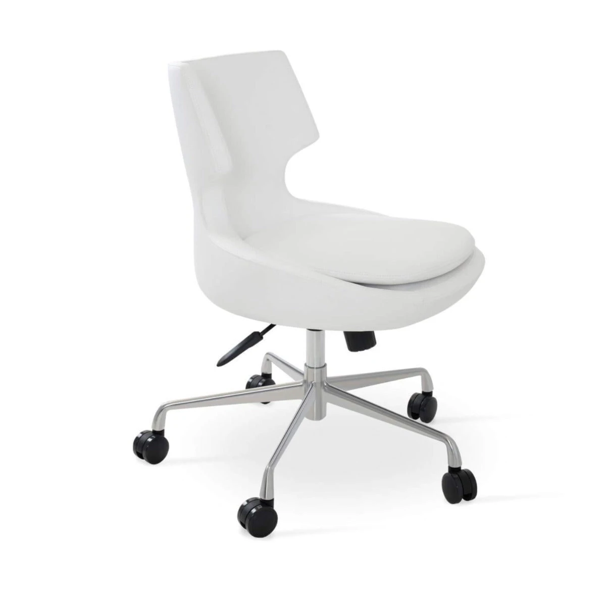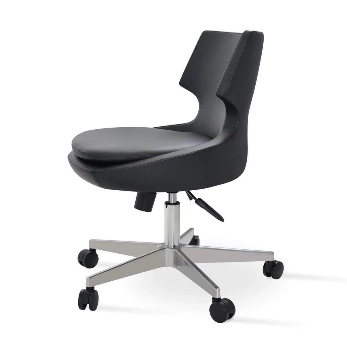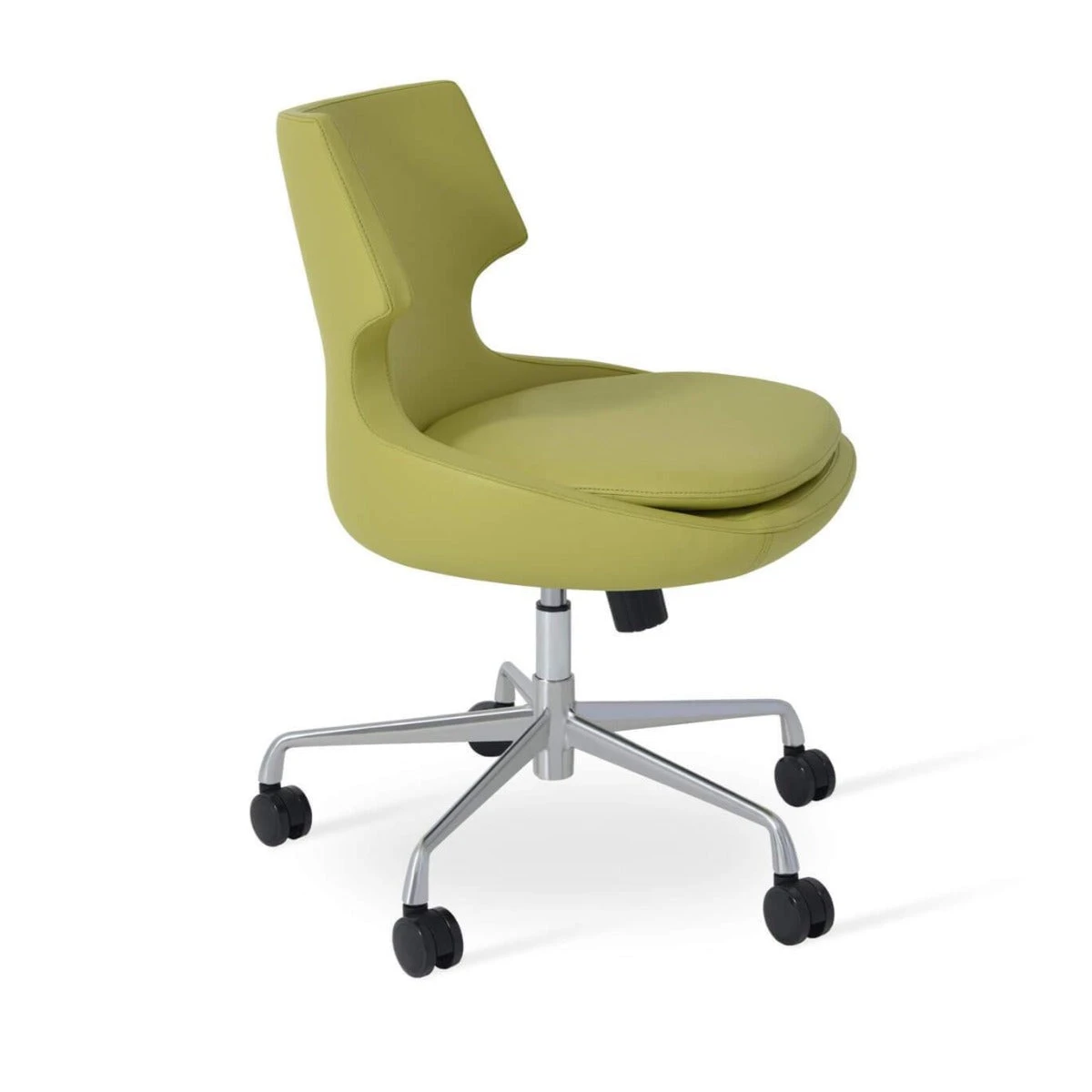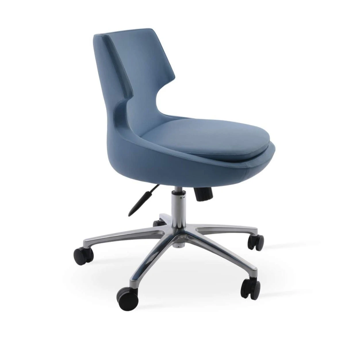 The Patara office is a distinctive chair featuring a comfortable upholstered seat and backrest on a height-adjustable gas piston base that swivels and tilts. The chair has a five-star base with plastic casters. The seat has a steel structure with “S” shape springs for extra flexibility and strength. This steel frame molded by injecting polyurethane foam.