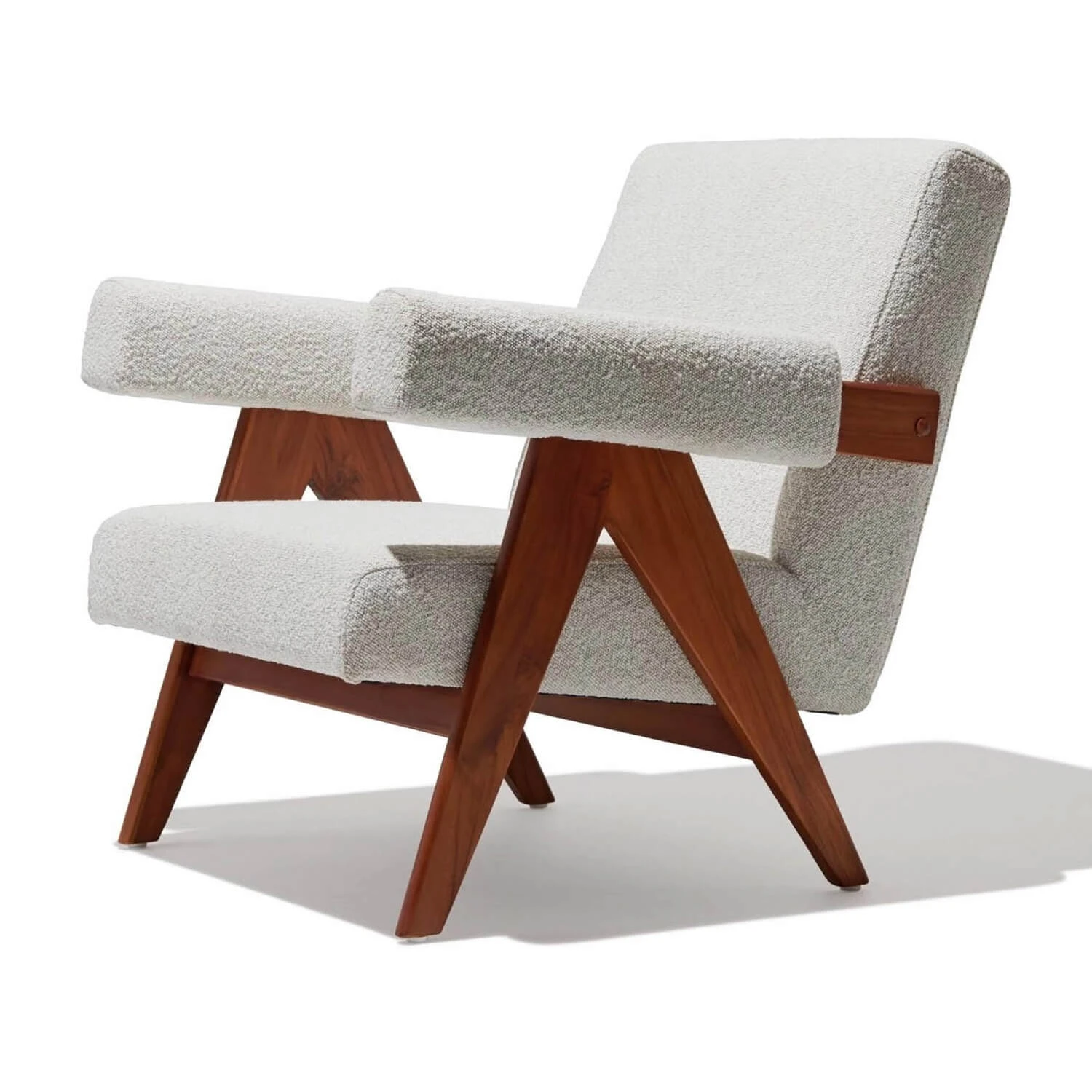 The Pierre J. Lounge Chair has a contemporary design featuring a white bouclé or hazelnut PPM upholstered seat, back, and arms on a solid ash wood frame. The Pierre J. Lounge is suitable for both residential and commercial use. This classic lounge chair would look perfect in almost any setting.