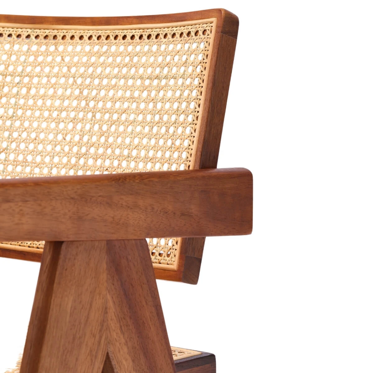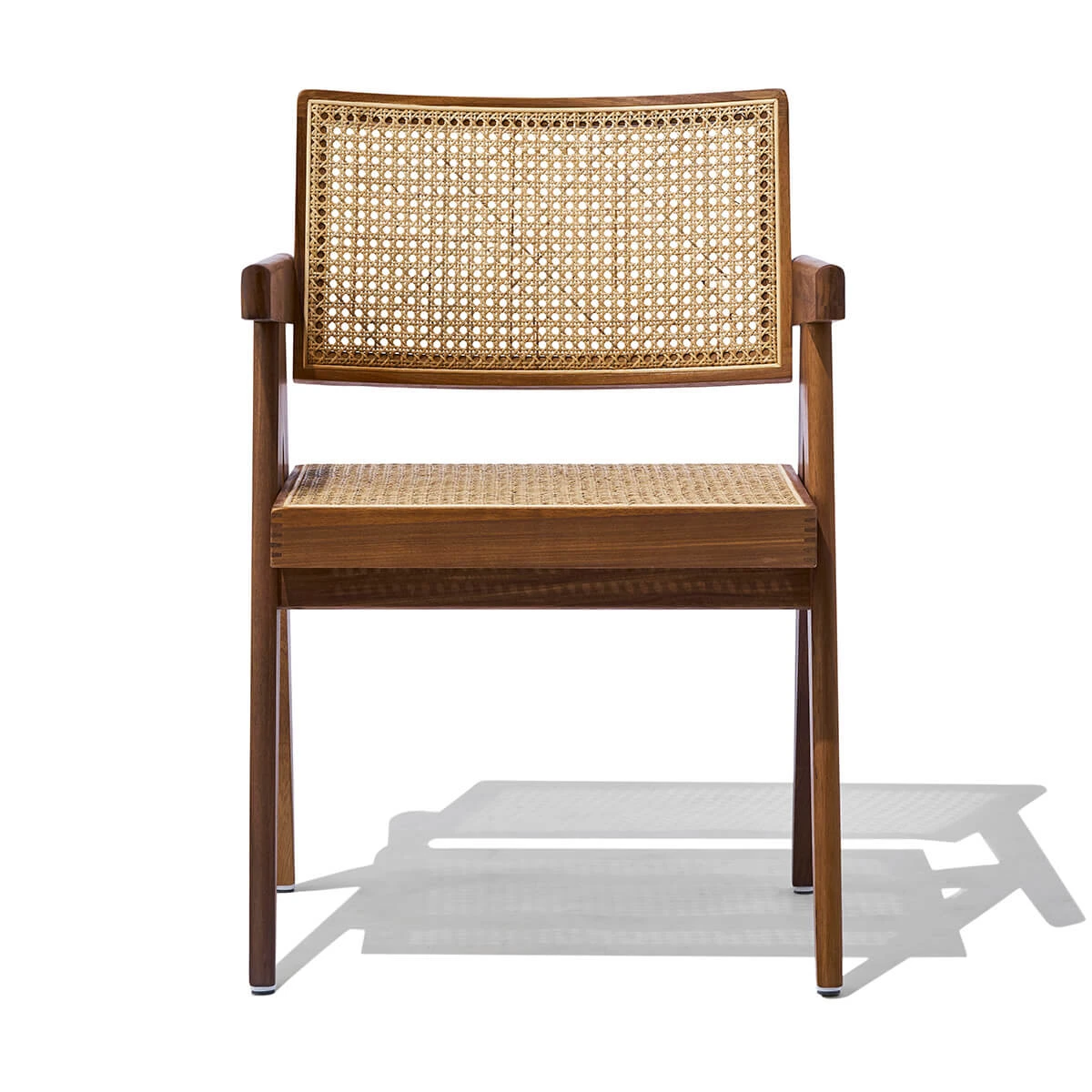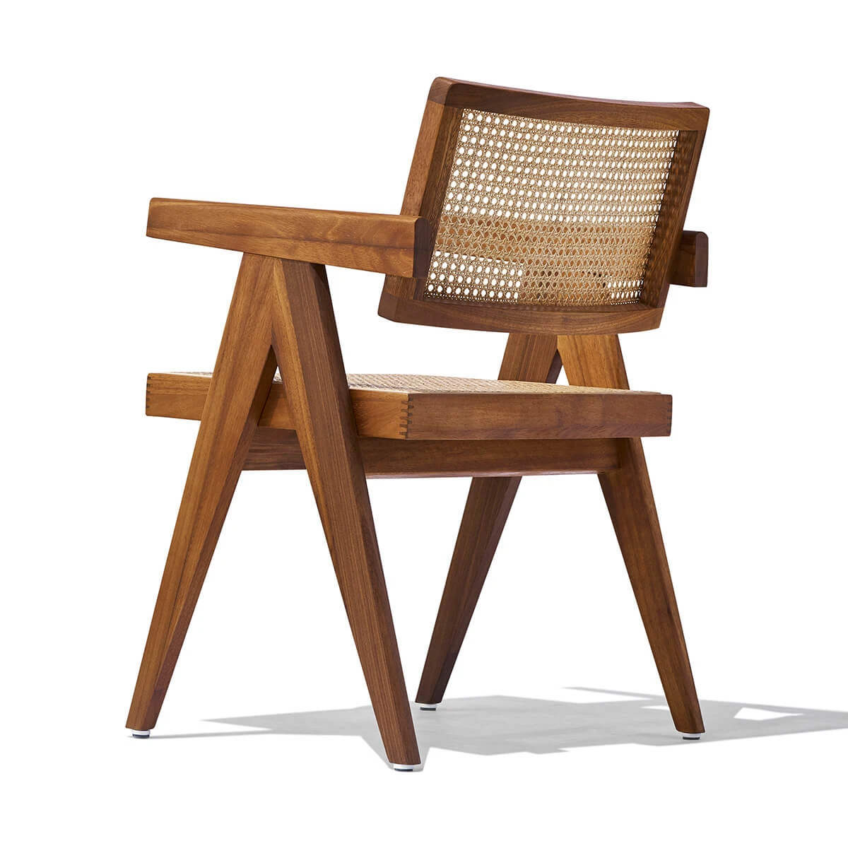 The Pierre J. Teak Arm Dining Chair is a contemporary chair with a natural cane seat and back. The legs are finished in solid teak. The Pierre J. armchair is great for both home and commercial settings. The Pierre J. teak armchair is great for indoors and outdoors.