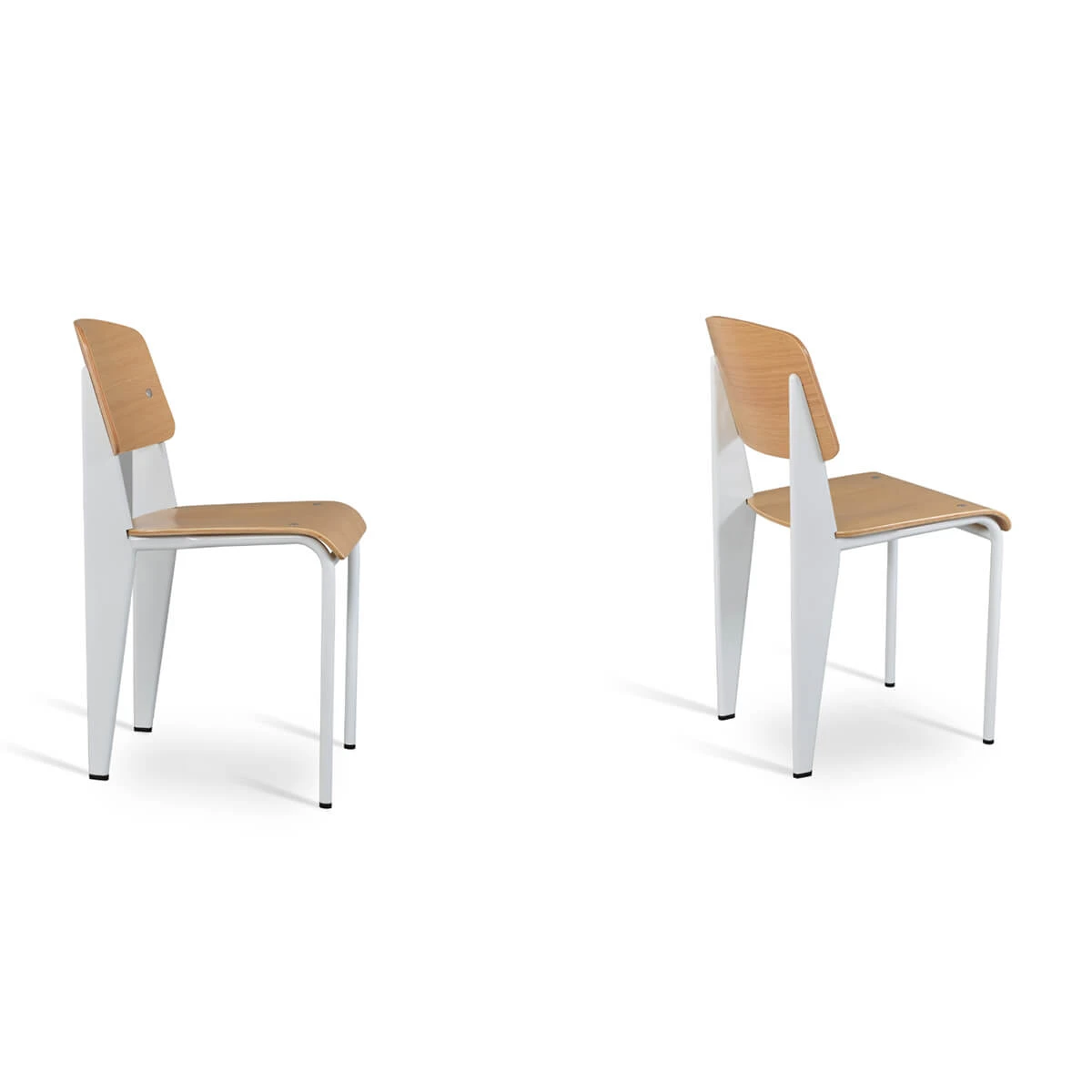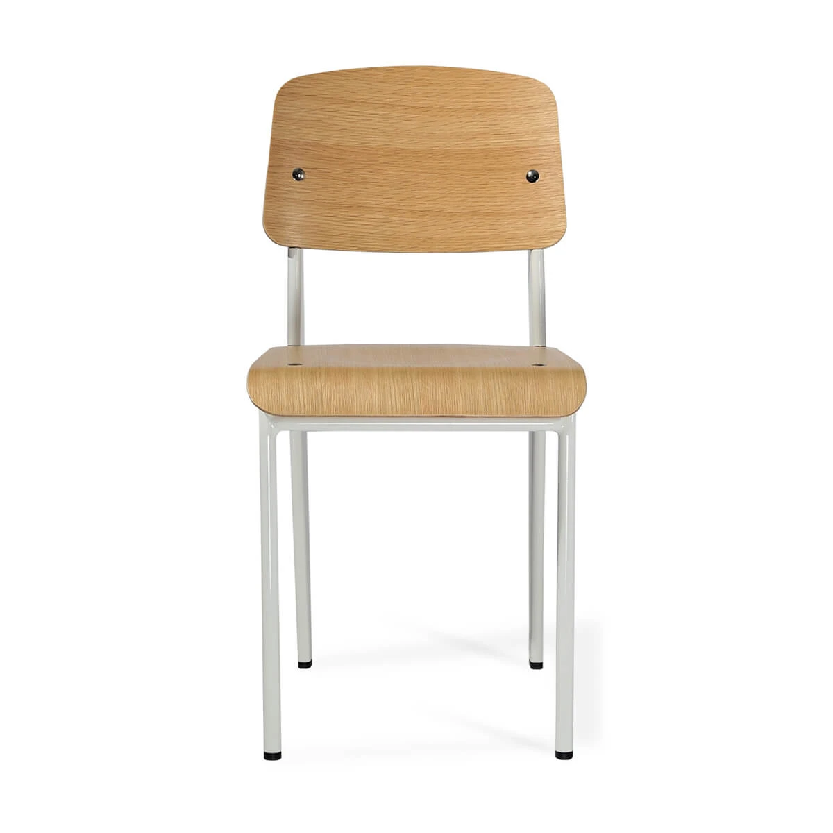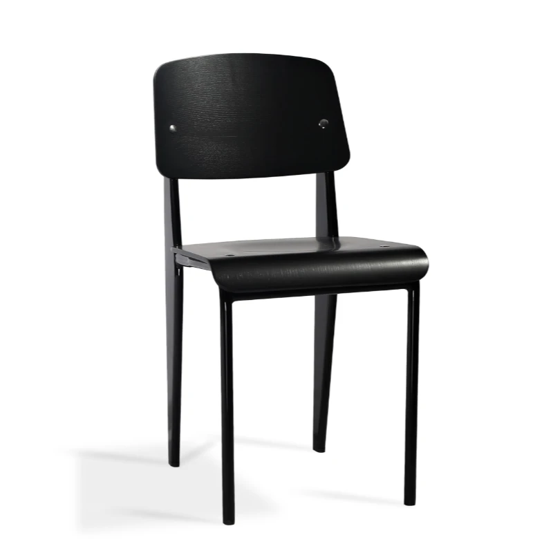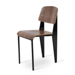 The Prouve Dining Chair has an industrial style featuring a plywood seat and a metal base. It’s great for both residential and commercial use and is available in three options.