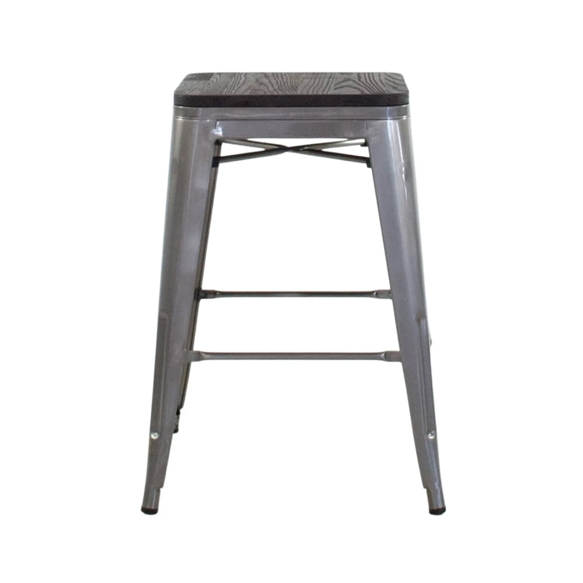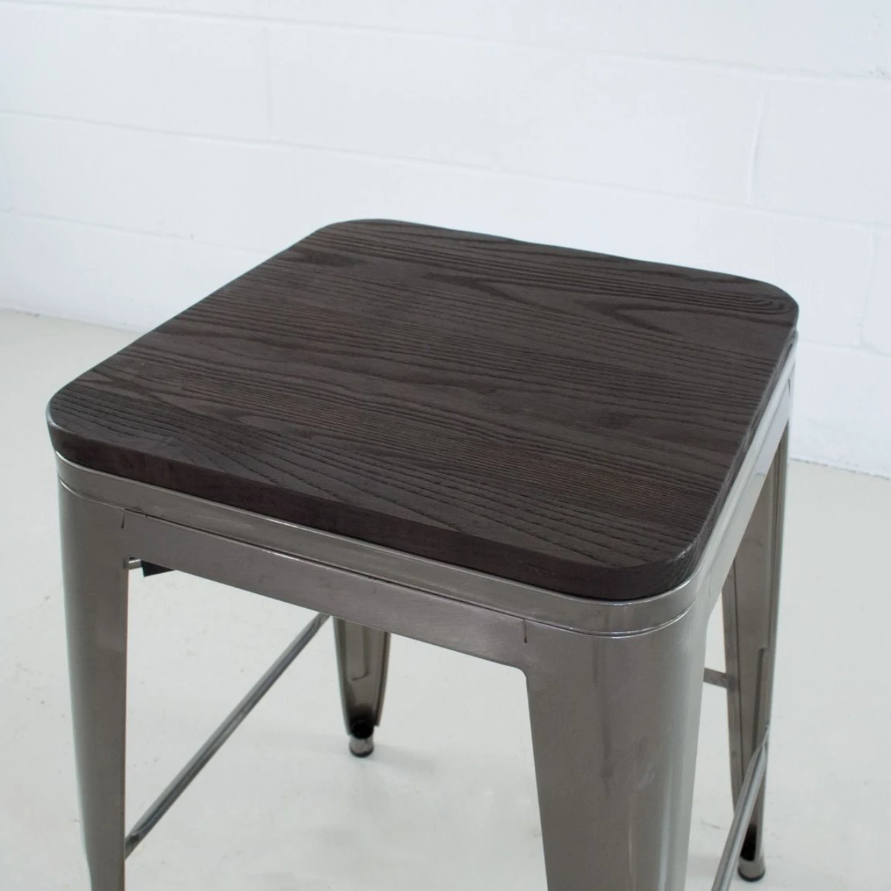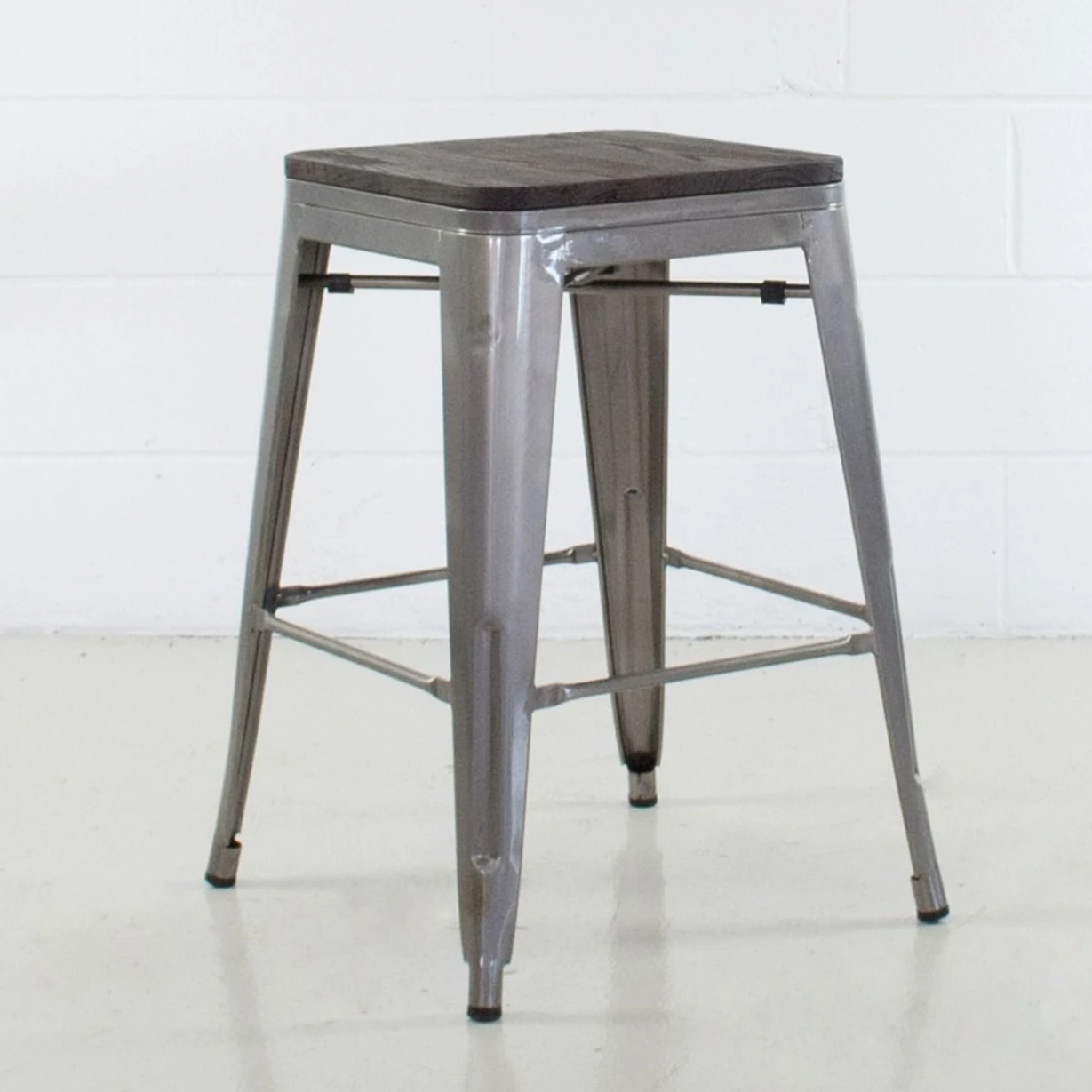 The Rochelle Grande Stool with Wood Seat features a solid elm wood seat with a metal base in a gunmetal finish. It’s stackable and perfect for home and commercial settings.