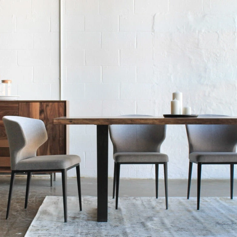The Thurston Fabric Dining Chair With Walnut Wood Imprint Metal Base is available in eight different polyester fabrics with a metal base finished with a walnut wood imprint. The Thurston dining chair is perfect for home and commercial settings.